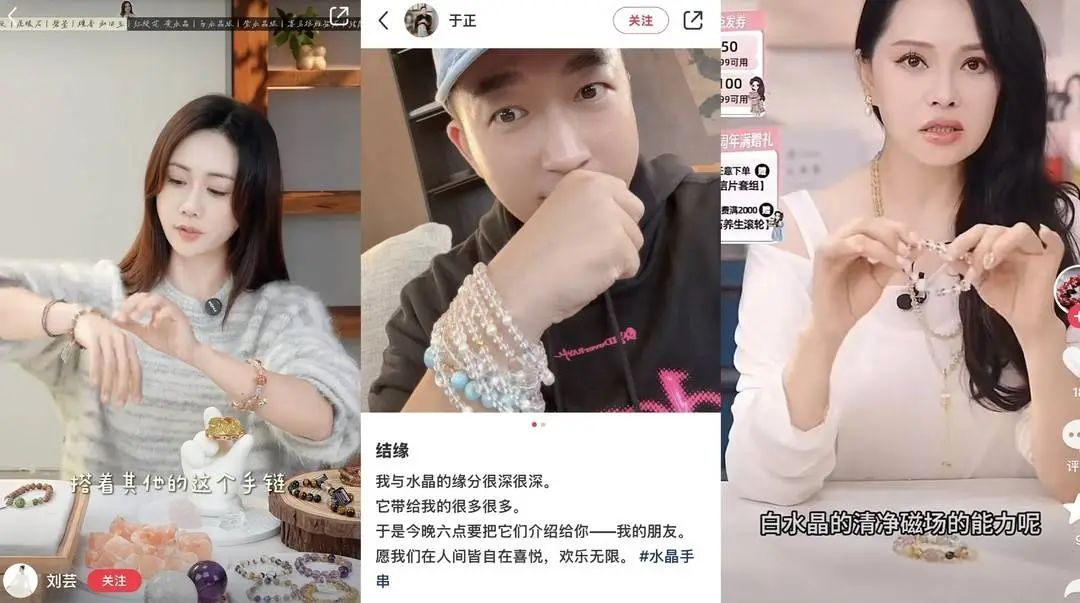 凌晨一点,江苏东海县的一个水晶直播间里,主播没有叫卖,也没有嘶吼。她只是看着弹幕里的星座留言,从身后密密麻麻的水晶格子里挑出几颗碎石,串成手链。一场四到六小时的直播,单价不过几美元的小石头,保底销售额能做到两万美元。还有商家靠“藏式水晶+能量叙事”,把1688上几十元成本的手链卖出6500元的平均客单价。头部星座KOL唐绮阳的一场线上课程,单价288.88元,吸引了1200多人购买,单场折合30多万元。