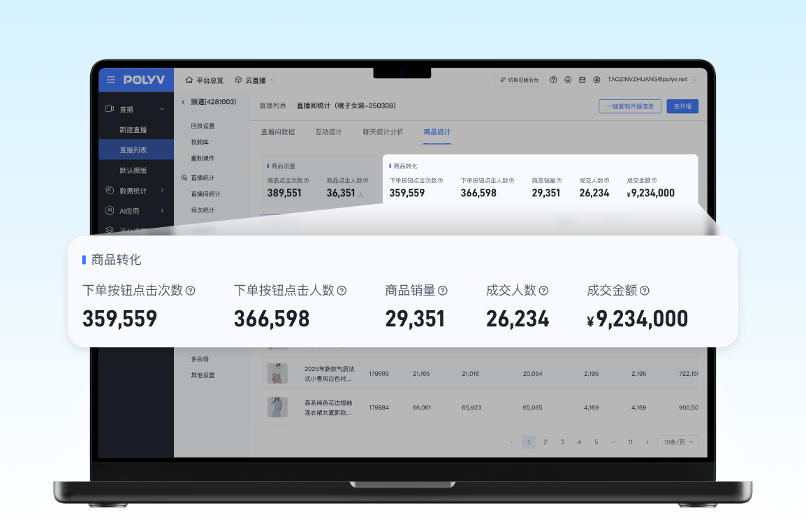 ·多维度数据统计:自动统计观看人数、时长、互动率、转化率等指标,生成可导出的详细报表;
