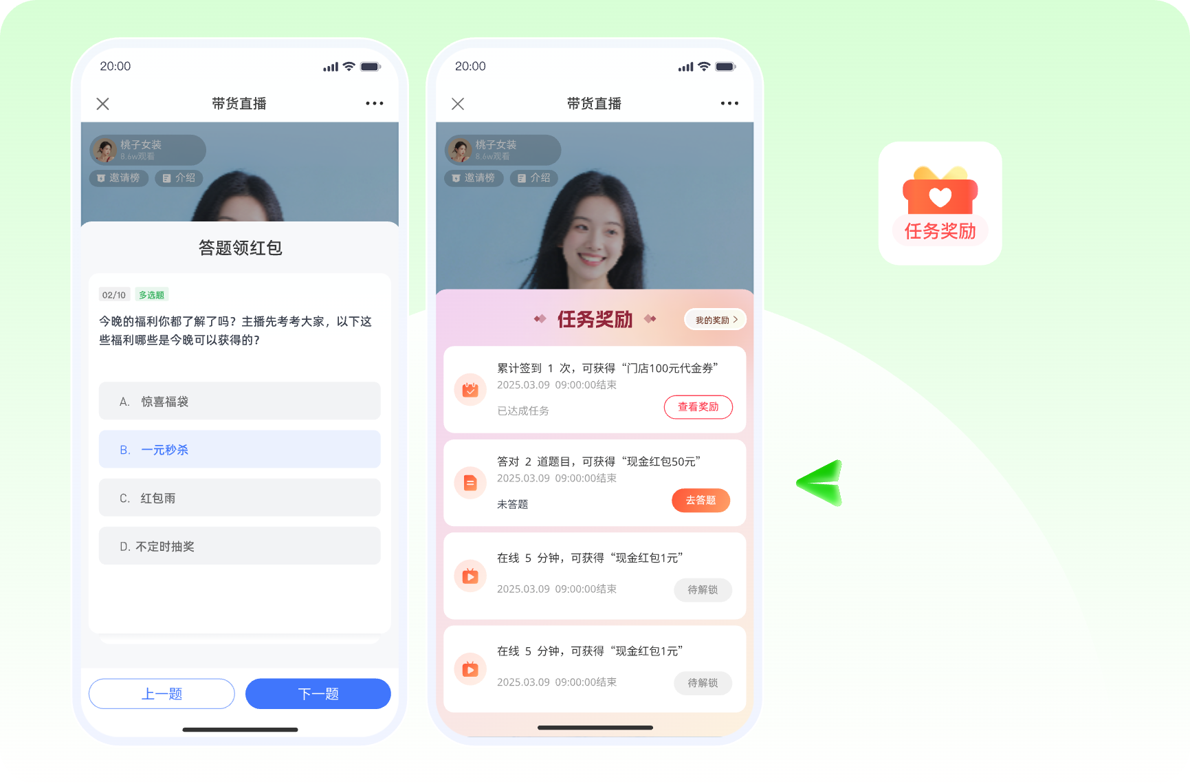 ·互动任务:如设置 “邀请好友观看”“评论指定话术” 等任务,完成后可领取优惠券、资料包等奖励,实现裂变引流与活跃提升双赢。
