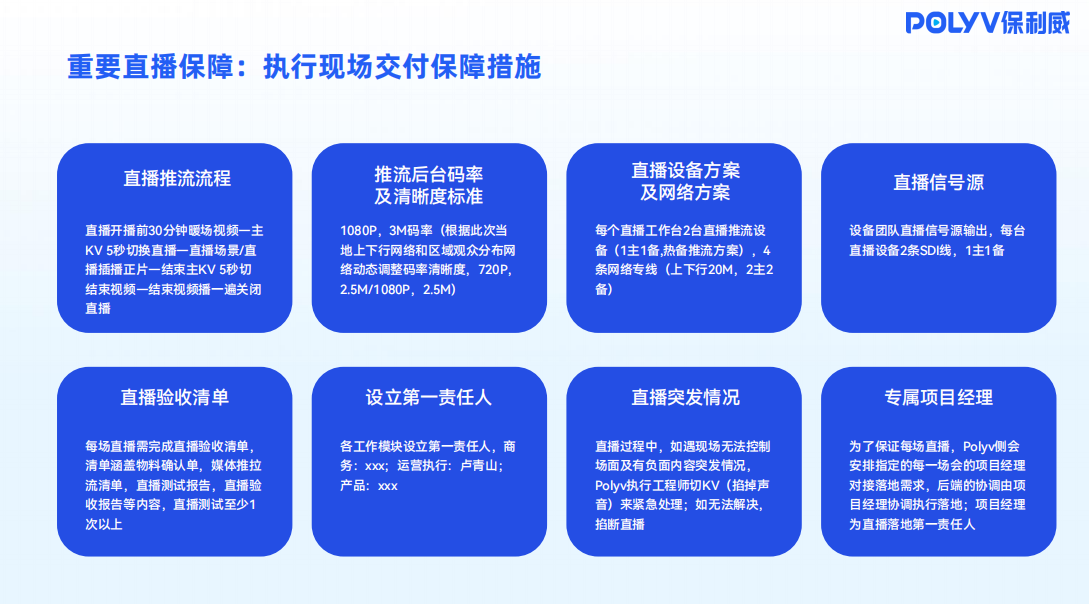 以企业直播领军服务商保利威为例,它不仅具备独家自研的PRTC无延迟直播技术,拥有全球10000+CDN分发节点,还支持1080P-4K高清画质及千万级并发等优越性能,更提供全链路活动直播运营服务。服务覆盖前期创意策划、流程设计、品牌定制、预热推广,现场拍摄、导播、灯光、场控的全流程环节,实现一站式落地执行。此外,保利威更将连续六年服务央视春晚、200余家世界500强企业的实战经验,沉淀为一套标准化的“活动直播SOP”。这套流程严格规范了从需求分析、方案设计、测试彩排到现场执行、应急演练的每个环节,确保以最高水准稳定交付。