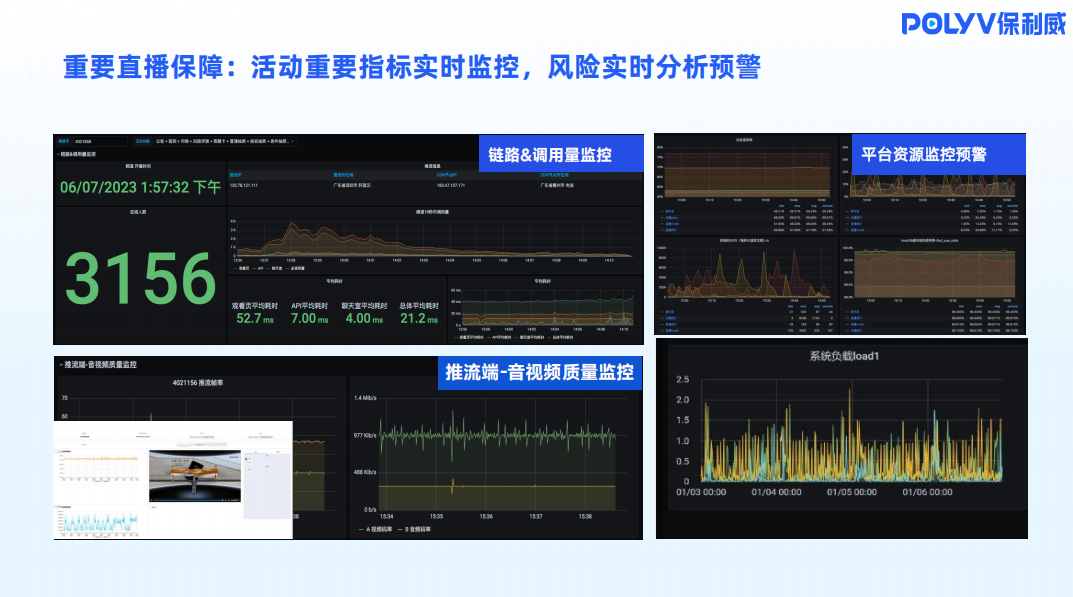 2.活动中是否有调控:按照规范的推流流程节奏推进,重要指标实时监控,风险实时分析预警。呈现从推流端、传输链路到分发节点,指标涵盖延迟、抖动、丢包率等,秒级自动排查与纠错。若出现不可控场面或执行类突发问题,能立即启动信号与声音的应急调控处置。