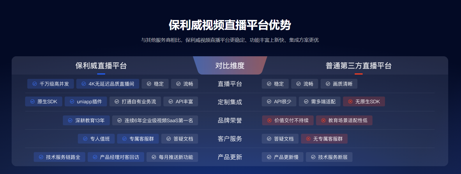 保利威为企业提供Webview集成、原生SDK集成、插件化+SDK集成及ODM定制等直播技术方案。机构可通过保利威提供的直播SDK&API,将直播间播放器嵌入自有小程序或App中,实现低成本二次开发、快速上线。同时,保利威开放了丰富API回调,可自定义数据回收,覆盖观看人次、时长等多类指标。直播间功能齐全,由保利威维护更新,集成配置简单,能够和学员管理、CRM、企微等业务系统打通,精准回收用户数据,为运营策略提供数据支撑。