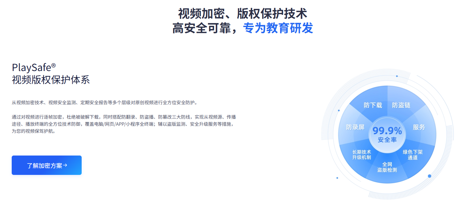 对于教育机构而言,名师课程是最珍贵的知识产权。保利威为此提供金融级安全保护,自研PlaySafe®视频安全体系集成VRM13碎片化加密、防下载、防盗链。业内首创H5播放器加密、APP、网页、微信全终端加密保护,可指定网站播放,一ID一码观看,避免非法传播,支持浏览器防录屏、ID跑马灯、AI视频水印等,从源头有效震慑与防止课程被非法传播,保障机构的核心商业利益。