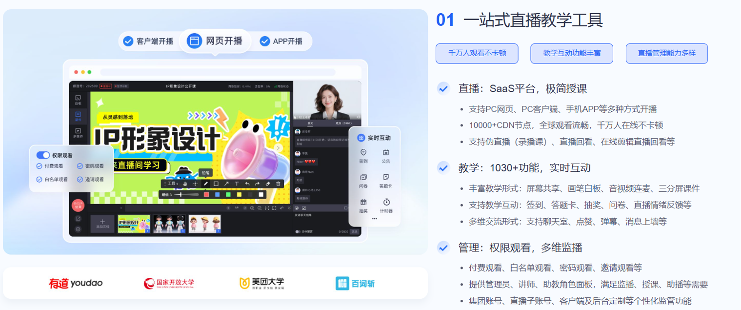 在教学端,讲师能通过屏幕共享、画笔白板、三分屏课件等多种形式清晰地展示知识点,并使用画笔工具对重点进行圈画讲解,高度还原线下课堂的板书与互动场景。为进一步确保教学效果并激活课堂,平台集成1030+实时互动功能:讲师可随时发起签到、答题卡、抽赏、问卷,例如在讲解一个难点后立刻发起测验,实时查看正确率,并针对错误率高的题目进行即时讲解,实现“讲-练-评”闭环。此外,助教可通过聊天室、点赞、弹幕、消息上墙及直播情绪反馈,与学员进行多维、及时的交流。