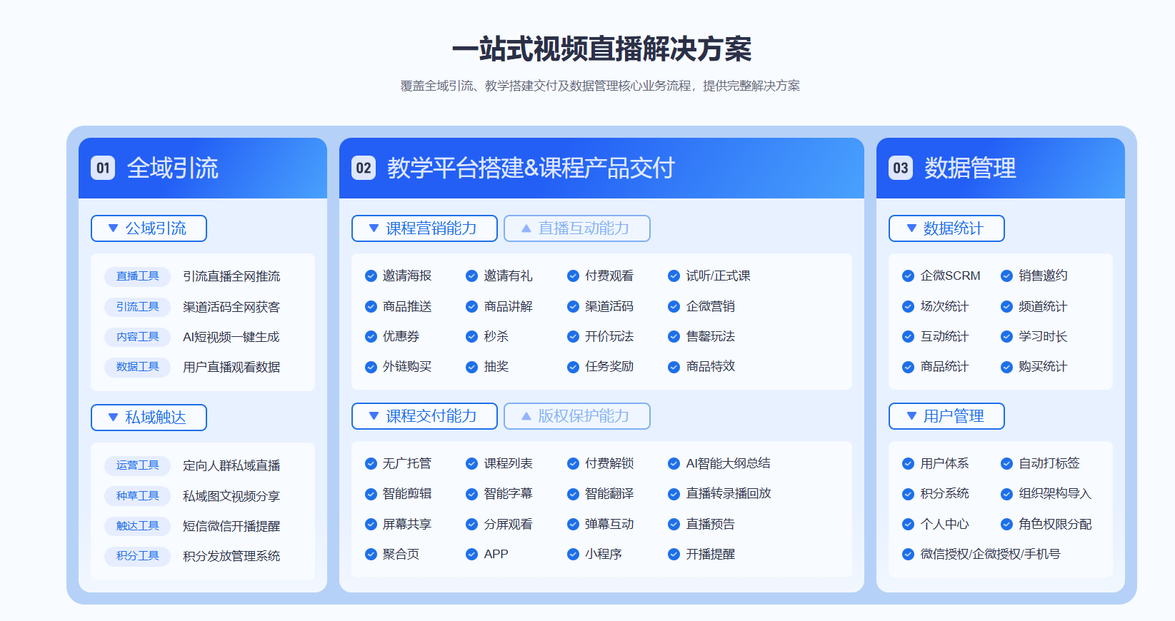 保利威为企业提供Webview集成、原生SDK集成、插件化+SDK集成及ODM定制等直播技术方案。机构可通过保利威提供的直播SDK&API,将直播间播放器嵌入自有小程序或App中,实现低成本二次开发、快速上线。同时,保利威开放了丰富API回调,可自定义数据回收,覆盖观看人次、时长等多类指标。直播间功能齐全,由保利威维护更新,集成配置简单,能够和学员管理、CRM、企微等业务系统打通,精准回收用户数据,为运营策略提供数据支撑。