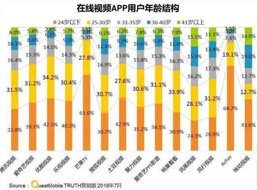 国内第一梯队的视频网站经历十多年的磨砺和探索,商业模式仍未逃出亏损的怪圈。但随着移动互联网生态的成熟,拥有消费能力的年轻代网络原住民群体崛起。在QuestMobile之前发布的数据中,在线视频APP用户年龄结构图显示,24岁以下的用户数均占各自用户群体的大头,可见在线视频APP的用户结构在加速年轻化。乐视视频则以超过40%的24岁以下年轻用户比例,超越腾讯、爱奇艺等老牌视频网站。