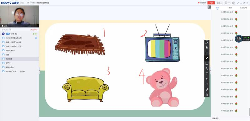 老师画面,可以让同学们清楚感知与老师同在,有亲切感;白板画笔配合PPT,让学生一目了然看到所要学习的内容;直播聊天室,让学生们讨论所学知识,不懂就问,锻炼孩子们输入英文的速度和正确率。