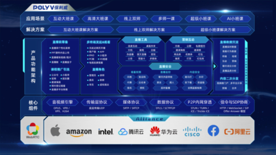 保利威基于webRTC技术进行底层优化,搭建出一套互动课堂解决方案体系,涵盖了互动大班课、高清大班课、线上双师、多师一课、超级小班课、AI小班课等等教育直播场景。