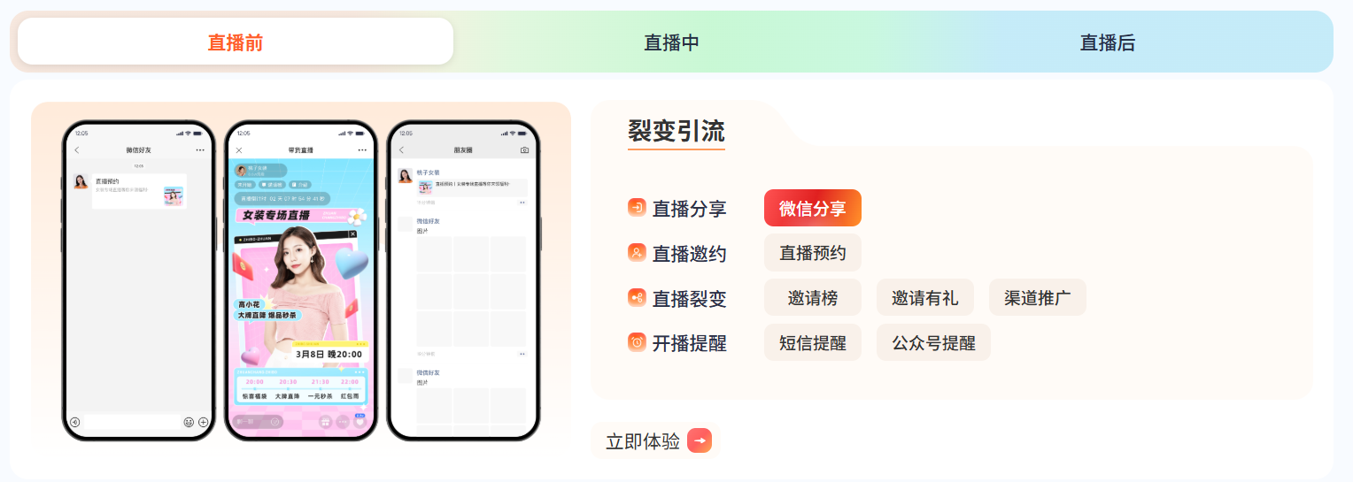 微信生态兼容:将直播链接转发至微信社群、朋友圈等,用户直接点击观看直播
