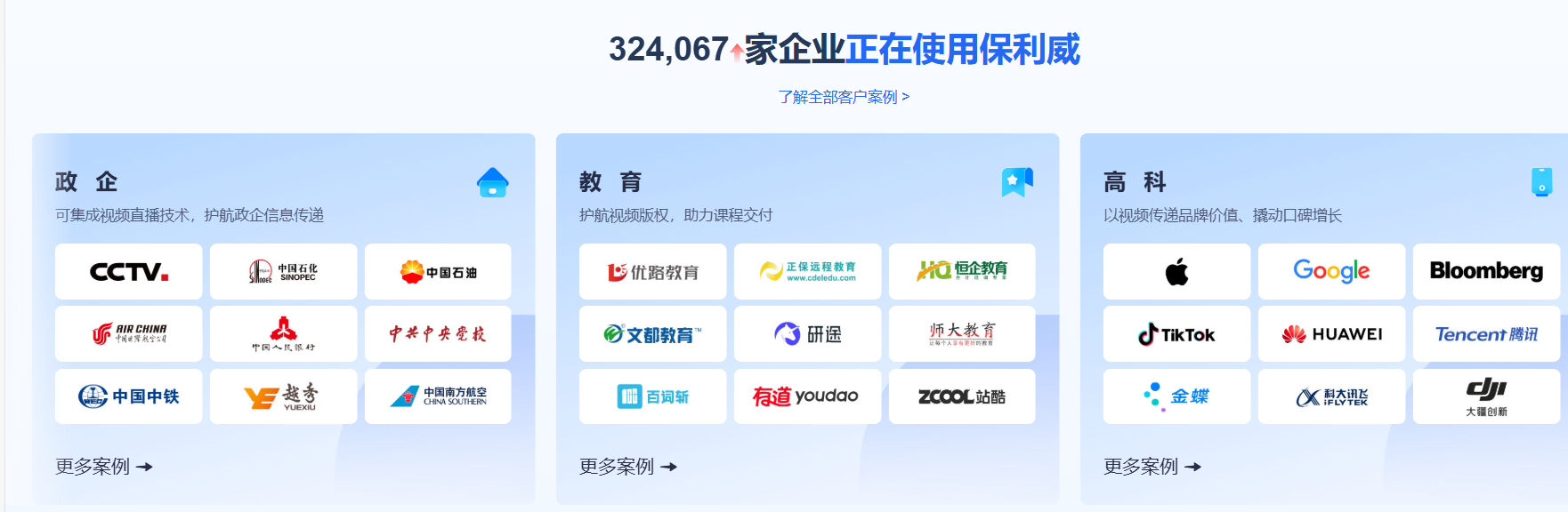 强大的多种能力:保利威提供从前期策划到现场执行的全流程服务,将主办方/企业从复杂的技术协调中解放。平台提供分发、互动、数据分析等1030+营销工具;460+API与SDK接口,为用户提供最灵活的直播商业组合;云分发功能,可一键将直播同步到到抖音、视频号、哔哩哔哩、TikTok、YouTube等200+主流公域平台,1-3秒完成配置,直播中可随时增删平台……