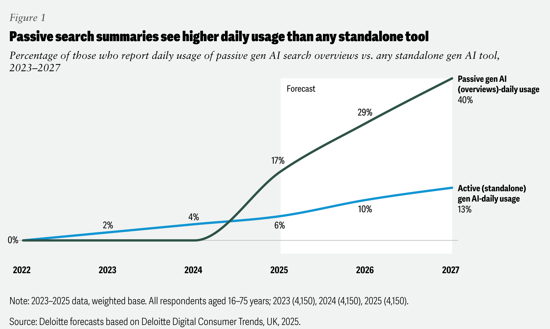 德勤Deloitte最新预测,到2026年中期,将有72%的成年人使用过AI搜索摘要,而每日使用AI搜索摘要的人群比例将达到29%,是独立AI工具使用率的近三倍(来源:Deloitte Insights《TMT 2026预测》)。换言之,AI正逐渐变成大众日常搜索信息的默认方式。