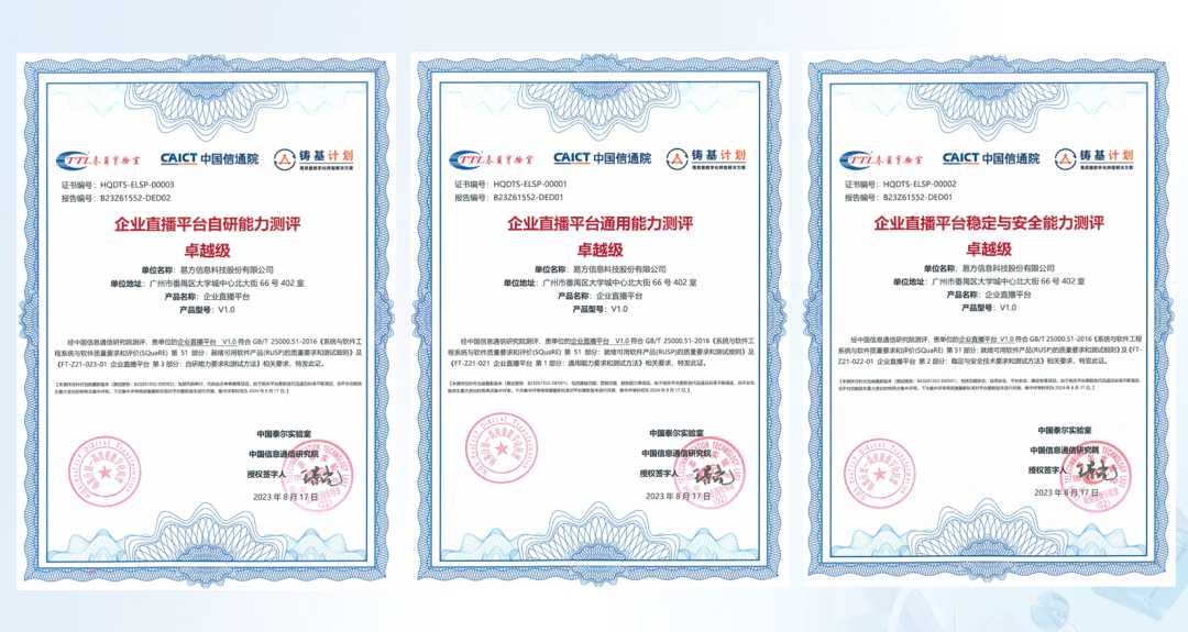 保利威企业直播平台荣获中国信通院“铸基计划”三项卓越级评测认证