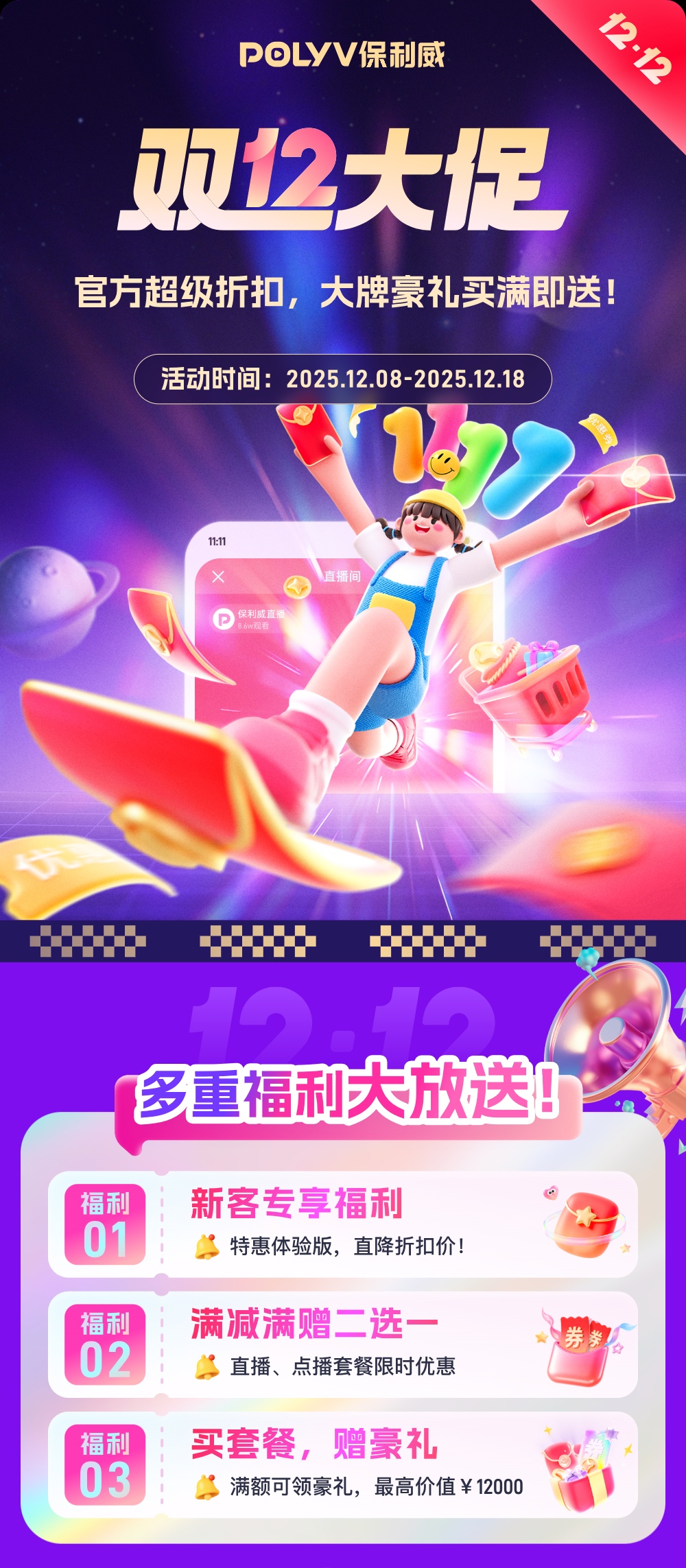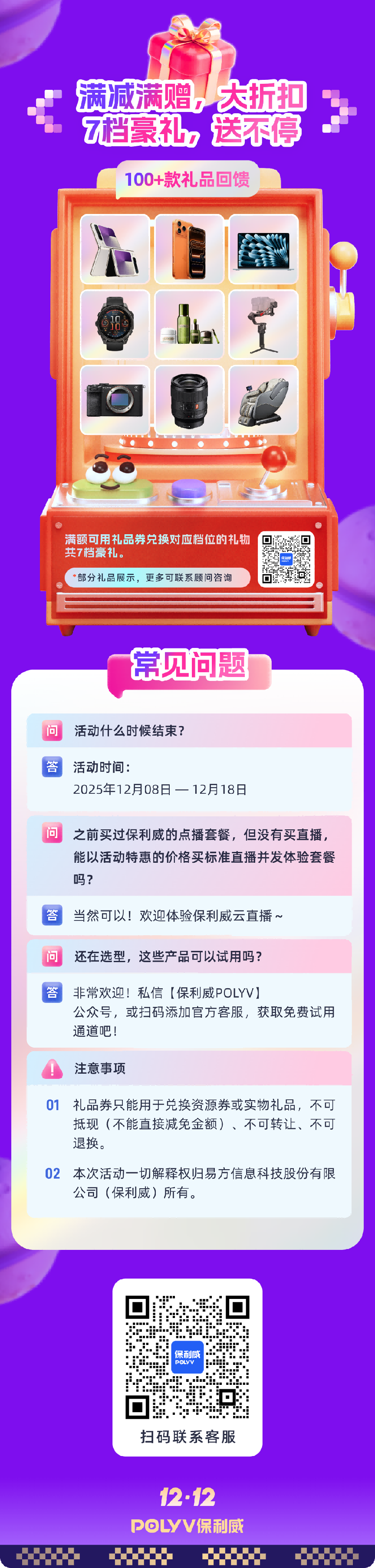 保利威双12大促来了!直播、点播套餐全年底价,最高¥12000赠礼等你领🥳