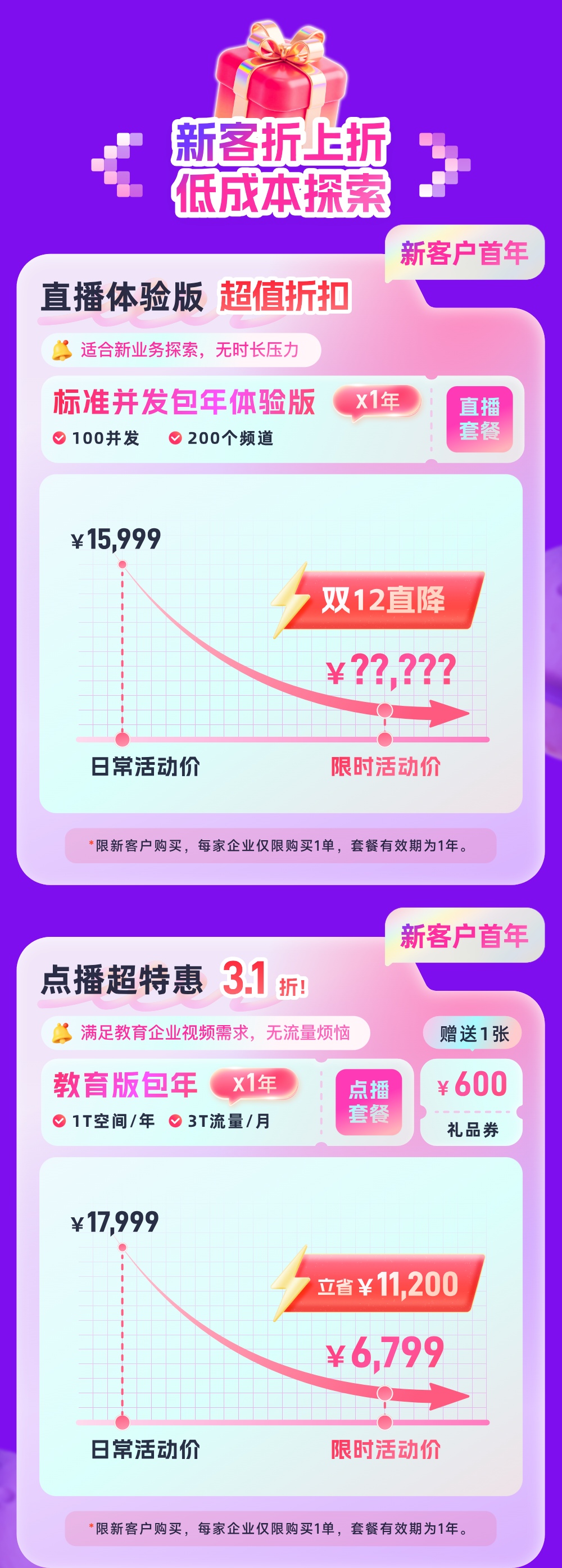 直播、点播可享新客秒杀特惠,错过等1年!除了低价直降,还有流量、资源点等福利派送,最高可加赠价值12000元超级豪礼!