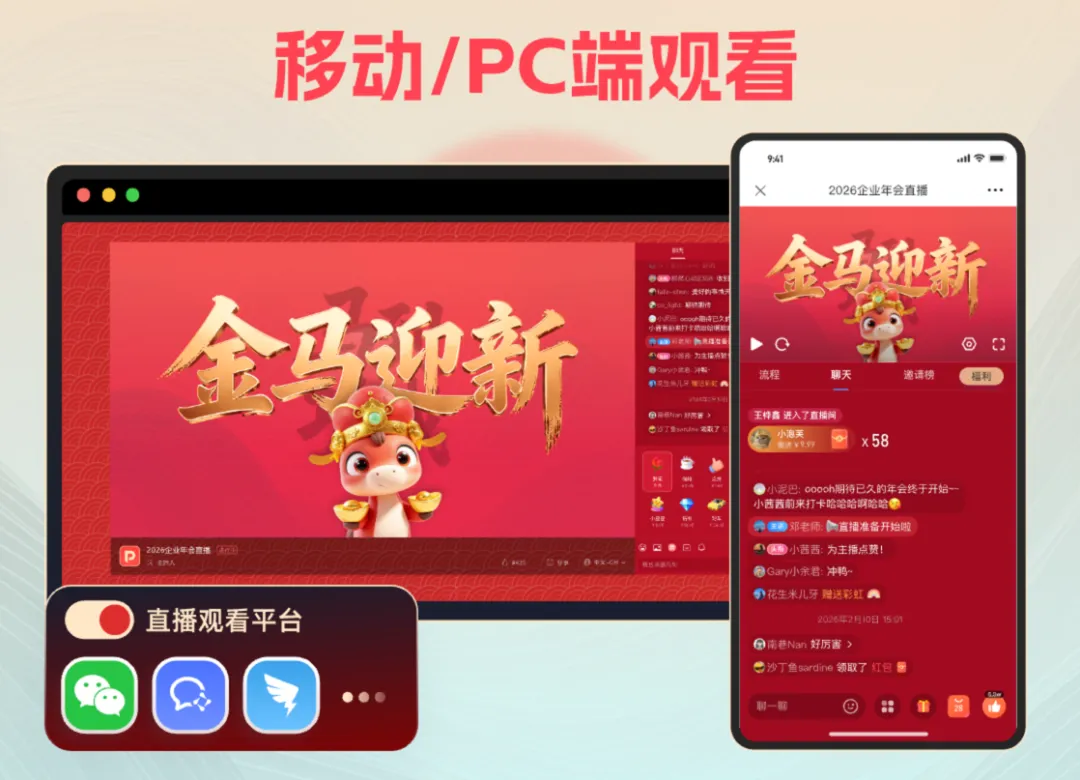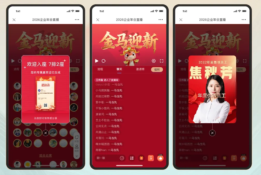 添加客户顾问,即可获取直播回放链接,以及免费申领《2026金马迎新年会直播方案》、年会直播demo及聚合页demo,帮你进一步降低年会筹备难度。