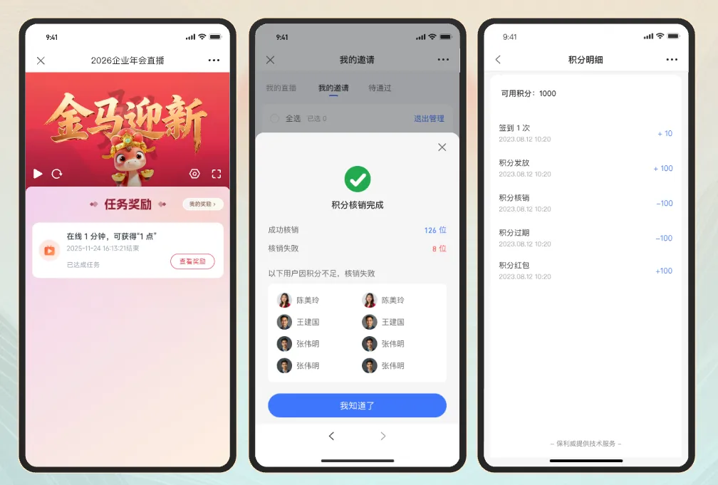 通过设置 “观看积分奖励” ,鼓励员工在直播间停留时间越长、可得积分越多,累计积分可以兑换年会纪念品。这样既能让年会充满趣味性,还能让员工一直留在直播间,全程热情参与。