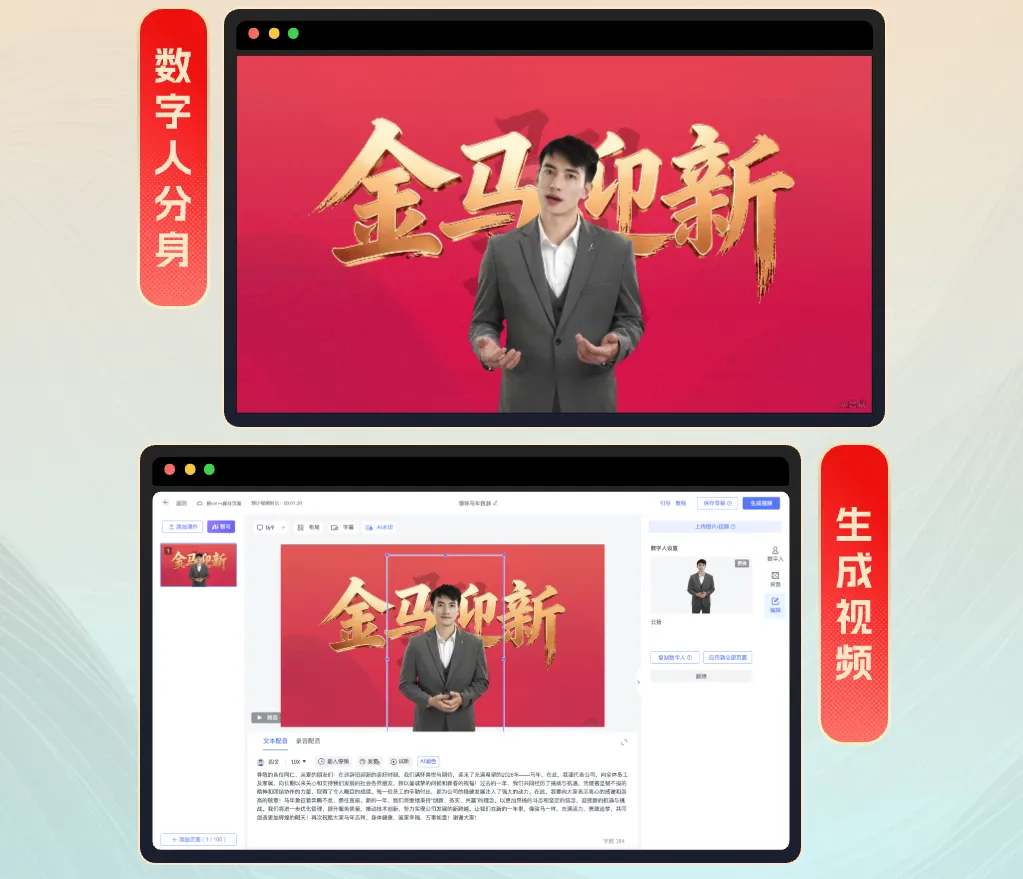 第二种是借助AI数字人分身,1:1还原老板形象与声音,用于开场致辞、颁奖提名等环节,且数字人可复用至后续企业培训、品牌宣传。