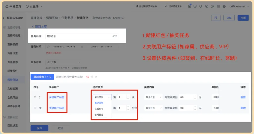 保利威直播平台支持按人群标签、分组设置抽奖/红包的参与范围,还能添加参与门槛,如 “观看时长满 30 分钟”“完成直播间签到” 等等。