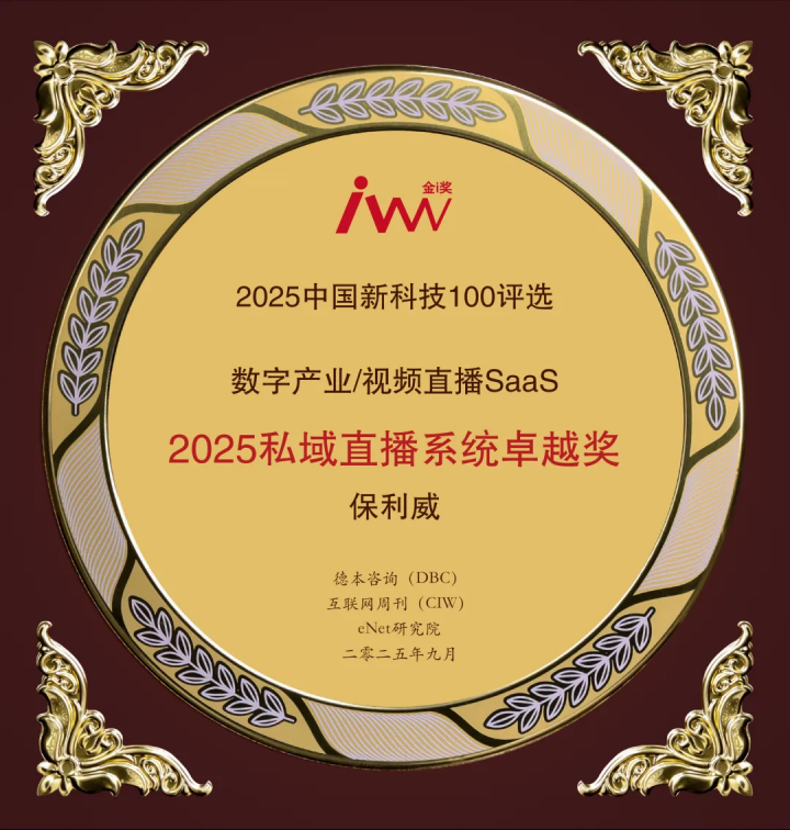 在2020至2025年中国科学院、互联网周刊发布的《企业视频SaaS直播服务商TOP35》榜单中,保利威凭借卓越的视频技术、直播技术连续六年稳居第一位,是企业直播行业的佼佼者。而在2025年,凭借稳定、流畅的私域直播技术与私域直播服务实践,保利威拿下了“私域直播系统卓越奖”,成为企业机构私域直播系统技术选型的优选服务商之一。