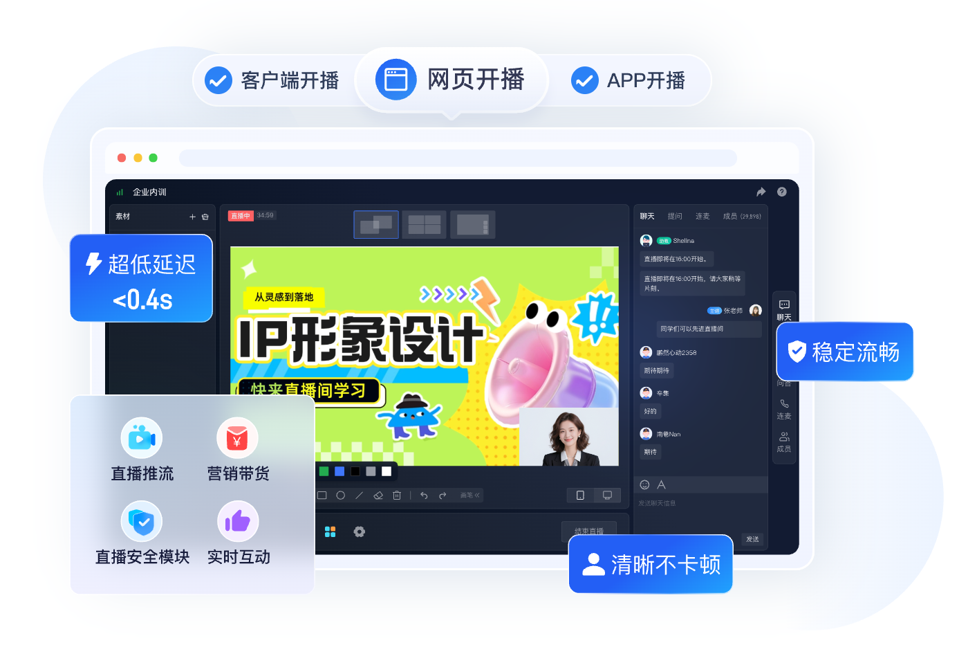 其中,云直播是保利威的“当家产品”,下图是保利威云直播开播端示意图,根据相关资料,自2013年上线以来,保利威云直播平台经历了多轮的升级,目前已搭建了管理端、开播端、观看端、中控台等工具,为企业营销、教学等场景使用者(如教师、助教、运营等)提供便捷协作服务。