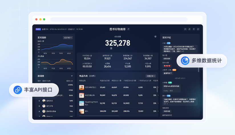 提供直播系统的原始数据,涵盖观看行为、互动行为、商品数据、营销行为等方面,便于企业对观众、商品、运营、助播等角色和模块做出科学分析决策。