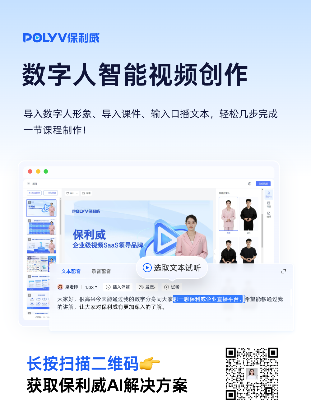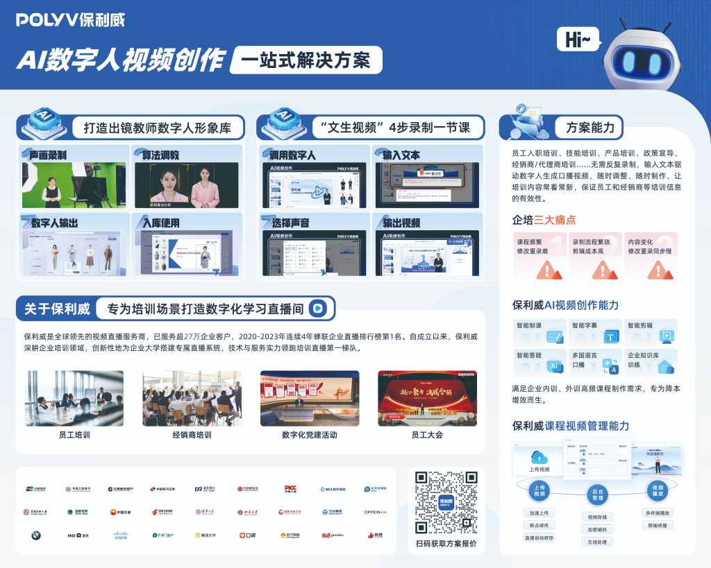 王建成就AI技术与视频新媒体的融合助力企业培训降本增效的具体方案及保利威的服务经验,给与会嘉宾讲述了AI数字人、数字人制课、智能多语言视频创作等企培内容新形态,其中,保利威AI智能视频创作所包含的智能剪辑、智能字幕等功能受到与会嘉宾认可,基于直播内容智能套剪片段知识的应用,更是串联了直播与视频,让企业培训在内容管理侧更高效。
