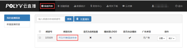 1.登陆保利威视并进入【云直播】界面,点击【频道列表】——【我的直播频道】,然后点击进入您想修改的频道名称(若还没有创建频道,可点击【新建直播频道】新创建一个频道),如图: