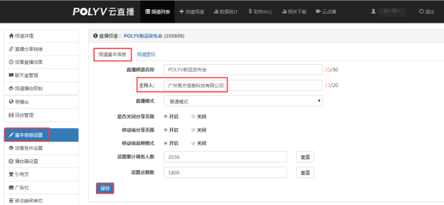 2.点击【基本信息设置】——【频道基本信息】,输入【主持人】名字,提交即可。如图: