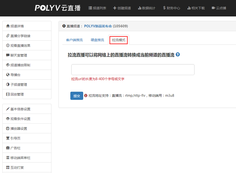 2.在左侧菜单栏拉到最下边选择【选择推流方式】——【拉流模式】,输入拉流地址即直播视频播放地址。需要注意的是,保利威视PC端播放器仅支持rtmp、http-flv,移动端观看页仅支持m3u8,请根据您的直播需求去获取相应的拉流地址并输入方框里。