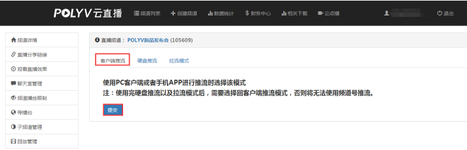 (1)当频道号不需要设置拉流模式时,需要在【客户端推流】处点击提交返回客户端推流模式,否则将无法使用频道号在直播客户端推流。如图: