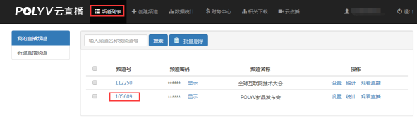1.登陆保利威视并进入【云直播】界面,点击【频道列表】——【我的直播频道】,然后点击进入您想进行导播台设置的频道号(若还没有创建频道,可点击【新建直播频道】新创建一个频道),如图: