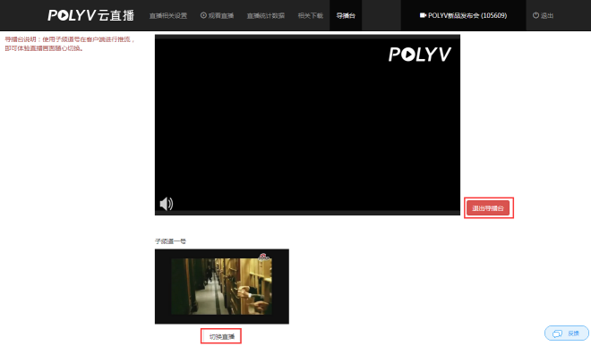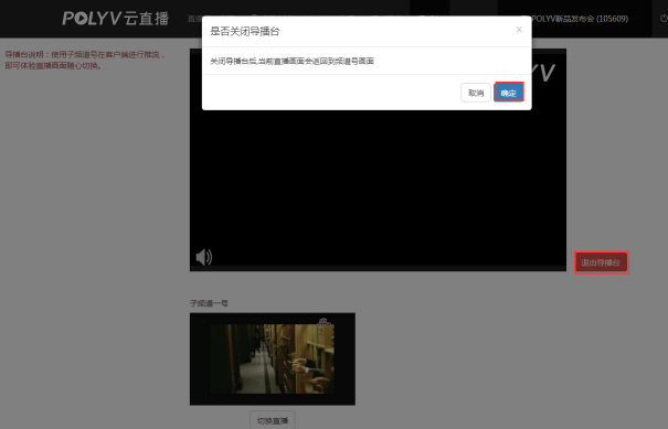 (2)使用完毕后一定要选择退出导播台,不能直接关闭浏览器,否则直播观看页将默认请求播放最后切换的子频道的流,可能导致频道号推流后无法在直播观看页观看;