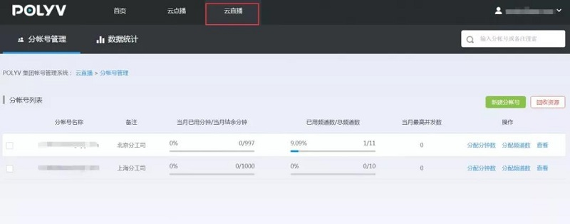 这里仅演示操作按分钟数计费方式对分帐号进行分钟数和频道数的分配与回收操作,按并发数计费方式操作与此相同,大家可参考操作。
