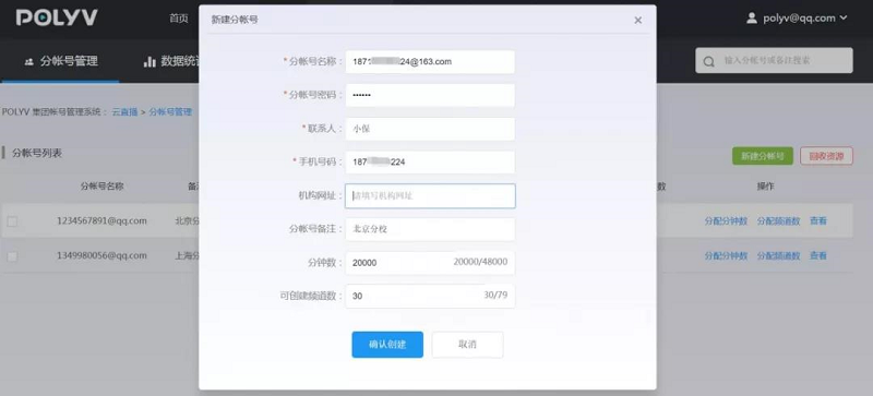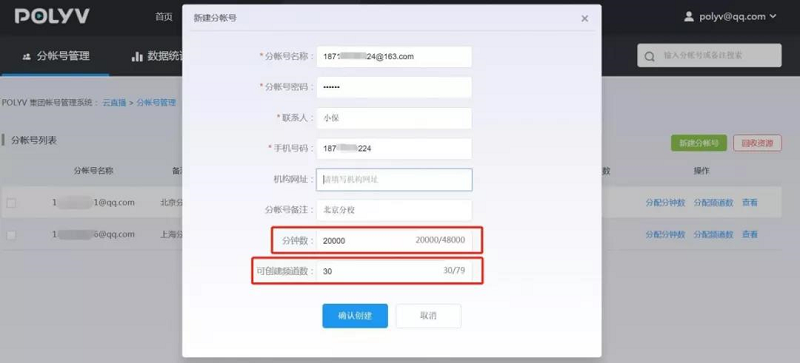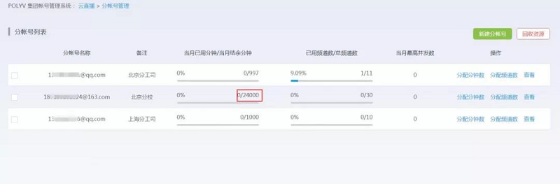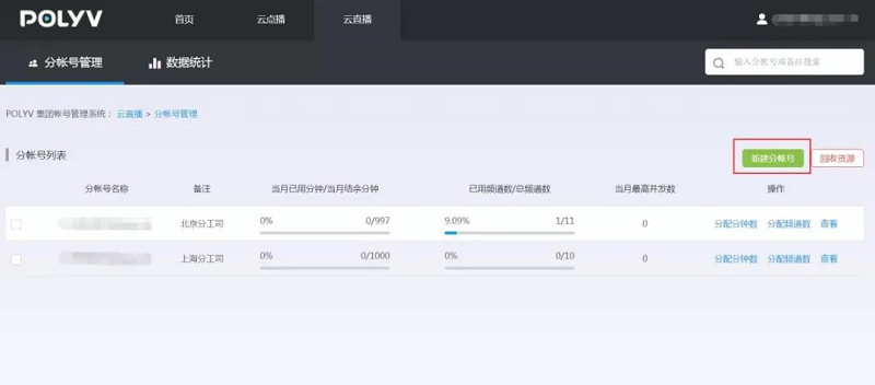 用户可采用两种方式为分帐号分配分钟数和频道数:可在创建分帐号时直接分配,也可在创建完成后对帐号资源进行调整。