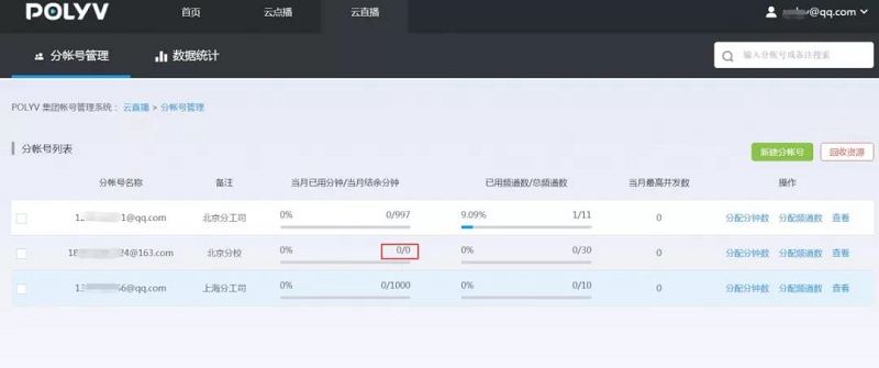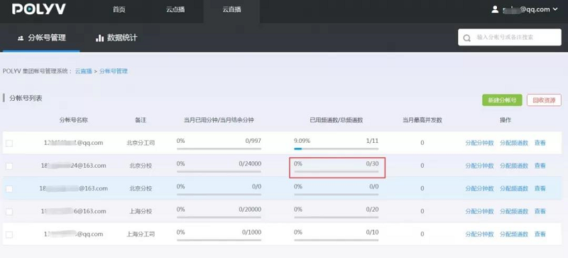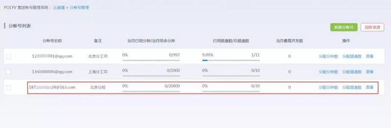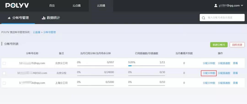 2、 分帐号创建完成后,点击“分配分钟数”和“分配频道数”分别对该帐号的分钟数和频道数进行分配操作。