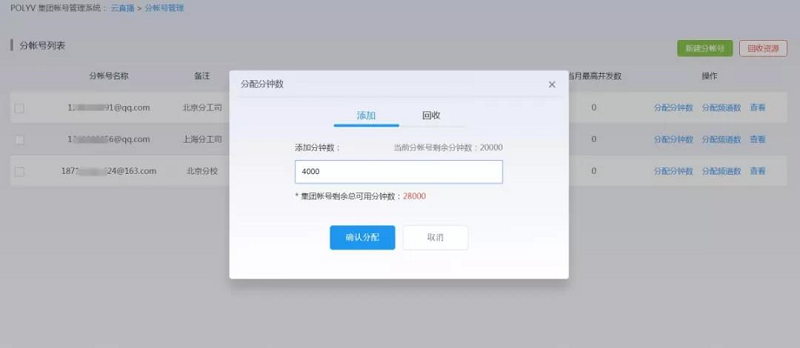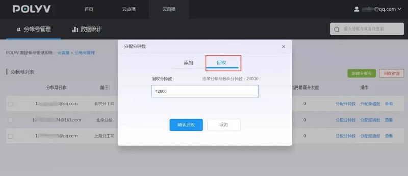 2、 部分回收分帐号可用分钟数。点击需要回收资源的分帐号“分配分钟数”按钮,在打开的弹窗中选择“回收”选项,然后填写需要回收的分钟数,点击“确定”按钮即可。