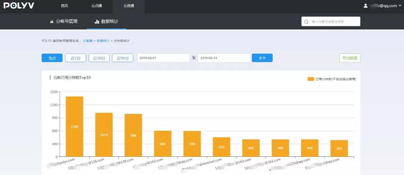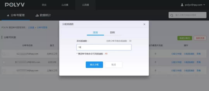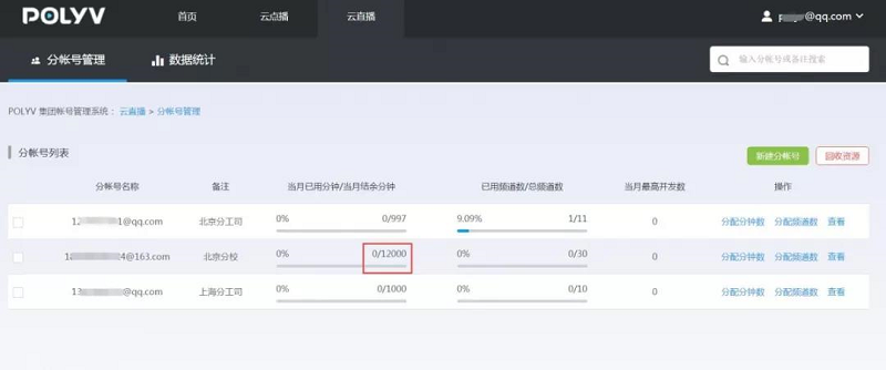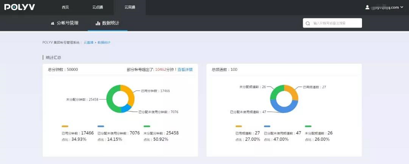 集团帐号是保利威根据客户需求开发的一项新功能。集团帐号可以创建多个分帐号,并可对这些分帐号分配或回收分钟数、流量和空间等。同时,集团帐号可以数据视图的形式统计、查看各分帐号分钟数、并发数、流量和空间的使用数据,以便运营人员更合理分配管理直播或点播资源。