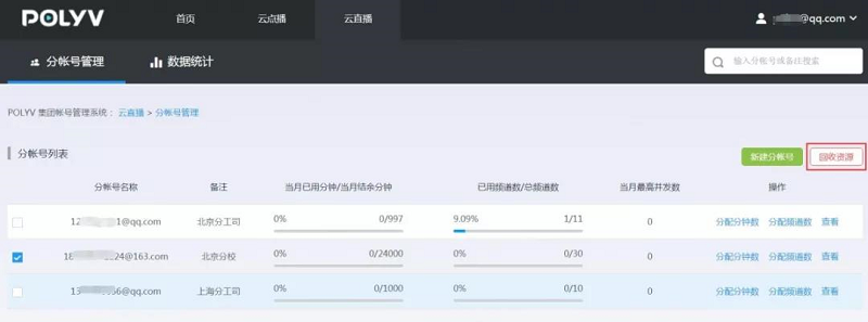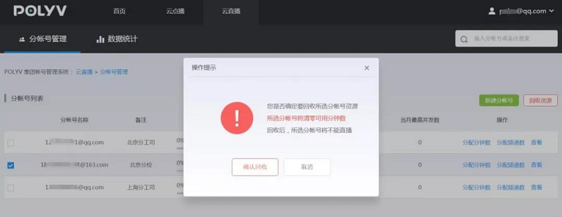 1、全部回收分帐号可用分钟数。勾选需要回收分钟数和频道数的分帐号,点击“回收资源”按钮,在弹出的弹窗中点击“确认”按钮,便可以将该分帐号的可用分钟数清零,回收至集团帐号;