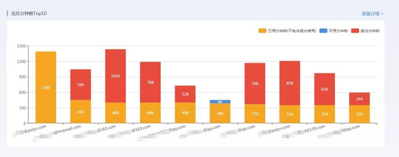 点击“查看详情”,可查看分帐号分钟数、并发数和频道数的详细数据,其中分钟数和并发数也可按“当月”、“最近7天”、“最近30天”、“最近90天”或者自定义筛选时间段等方式查看。
