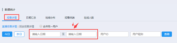 功能描述:在频道后台的数据统计处,观看详情可设置起止时间,最大可查询同一自然月30天内的观看日志,暂不支持跨月查询。