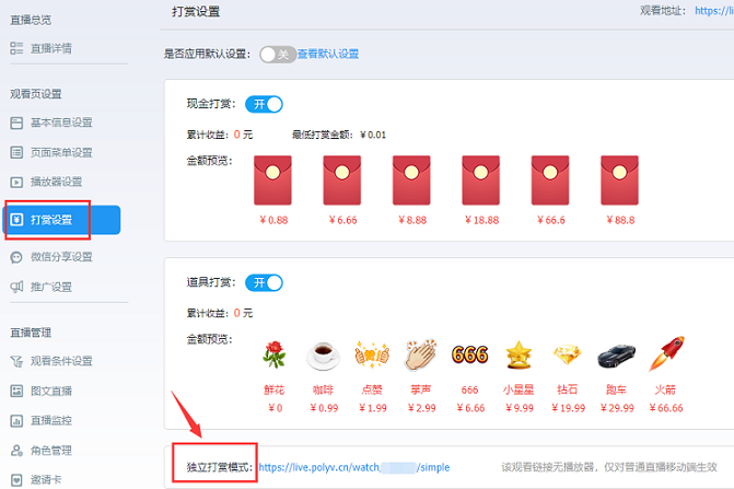 功能描述:独立的打赏观看页,仅提供各种互动功能,不提供直播视频观看,适用于现场与线上同步互动的场景。