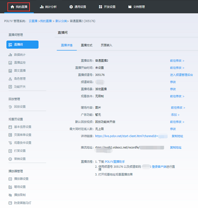 功能入口:我的直播–>频道统计–>数据统计–>观看详情