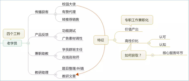 第二点是这样的人力有一个极好的性价比。首先由于他是你用户或者客户,对你有更好的认可;第二有更高的认知度,有的学员会比我们某些一线销售人员和客服人员更熟悉我们的产品,因为客户对这个产品比我我们工作人员还要衷心。在这个过程中,客户往往不是那么在意钱,他更在意能跟你做这件事本身。