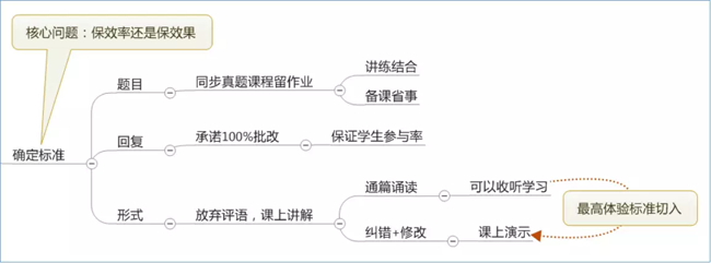 学生有需求,我们提供批改服务,用什么形式给大家做批改,给大家做批改到什么样的深度,这个时候我们教研做了一个很重要的判断,会直接影响关于超级用户能不能获取到,我们用最高的教学标准去设计这个服务过程。这是一种最高体验的标准切入,在判断效率和效果的选择上,如果保的是效率而不是效果,是得不到超级用户的。