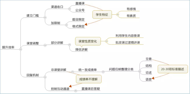 随着服务人数越来越多,在提升效率这一块就要加强。主要有三种方式:通过渠道收口、加限制等方式开始建立门槛,当你建立门槛以后,学生有两个特征,第一个往往是从你的教学内容上来的,所以对你有一点感情,第二是会有一定的素质。这两个东西是超级用户的特征,不是一般用户的特征。第二个是课程调整,利用学生内容备课、批改课过渡精讲课等方式使课堂性质发生变化。第三个把回溯机制做调整。