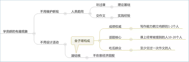 用“内容+社群”的方式去影响到更多的人。我的学员群有两个很有趣很重要的状态:第一不用维护群规,这个里面的人身份是趋同的;第二不需要我设置活动,凝结核的存在实现群的自运行。