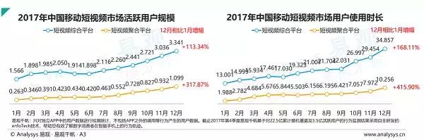 近年来,随着智能手机的普及和移动互联网的快速发展,短视频作为一种视频新形态出现在人们的视野。作为2017年现象级产品,短视频更是成为了各大资本追逐的新风口。据2018年2月1日,美拍和易观联合发布的《2017年中国短视频MCN行业发展白皮书》中指出,2017年以来短视频市场整体增速强劲,到12月份短视频综合平台和短视频聚合平台活跃用户规模达到3.341亿与1.099亿人。而在对用户时间的占用上,短视频综合平台和短视频聚合平台的用户使用时长分别在12月份达到34.857亿小时、10.256亿小时。各项数据与年初相比增长幅度均远超100%。