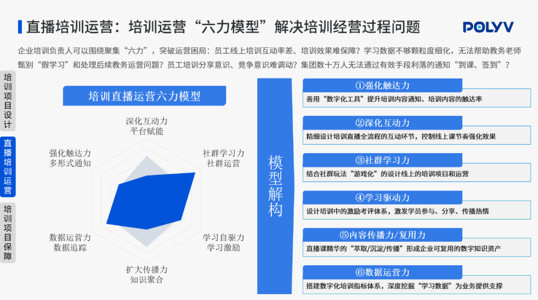 保利威深耕直播教培领域多年,归纳出直播培训运营“六力模型”——强化触达力、深化互动力、社群学习力、激发自驱力、扩大传播力、解析效果力,为金融机构应对直播培训痛难点提供有效的解决思路,解决直播培训运营过程中存在的问题。