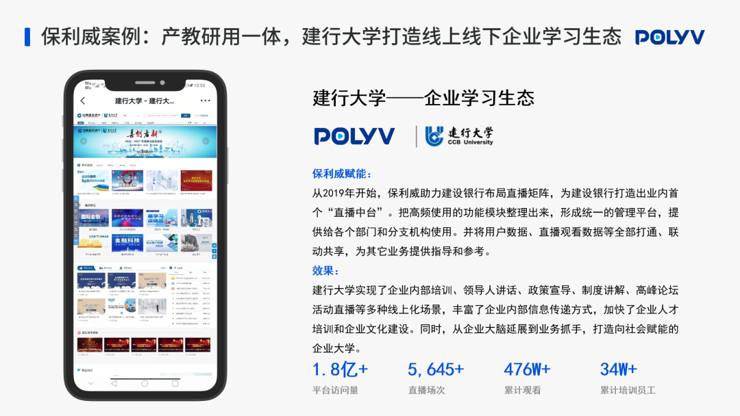 从2019年开始,保利威助力建设银行布局直播矩阵,为建设银行打造出业内首个“直播中台”。建行大学将高频使用的功能模块整理出来,形成统一的直播管理平台,打通了内部业务管理,各项工作得到更好的协同落地。