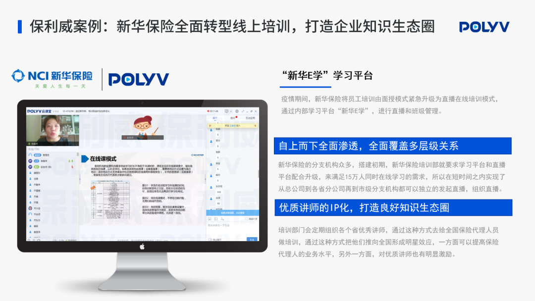 疫情期间,新华保险将员工培训由面授模式紧急升级为直播在线培训模式,通过内部学习平台“新华E学”,进行直播和班级管理。